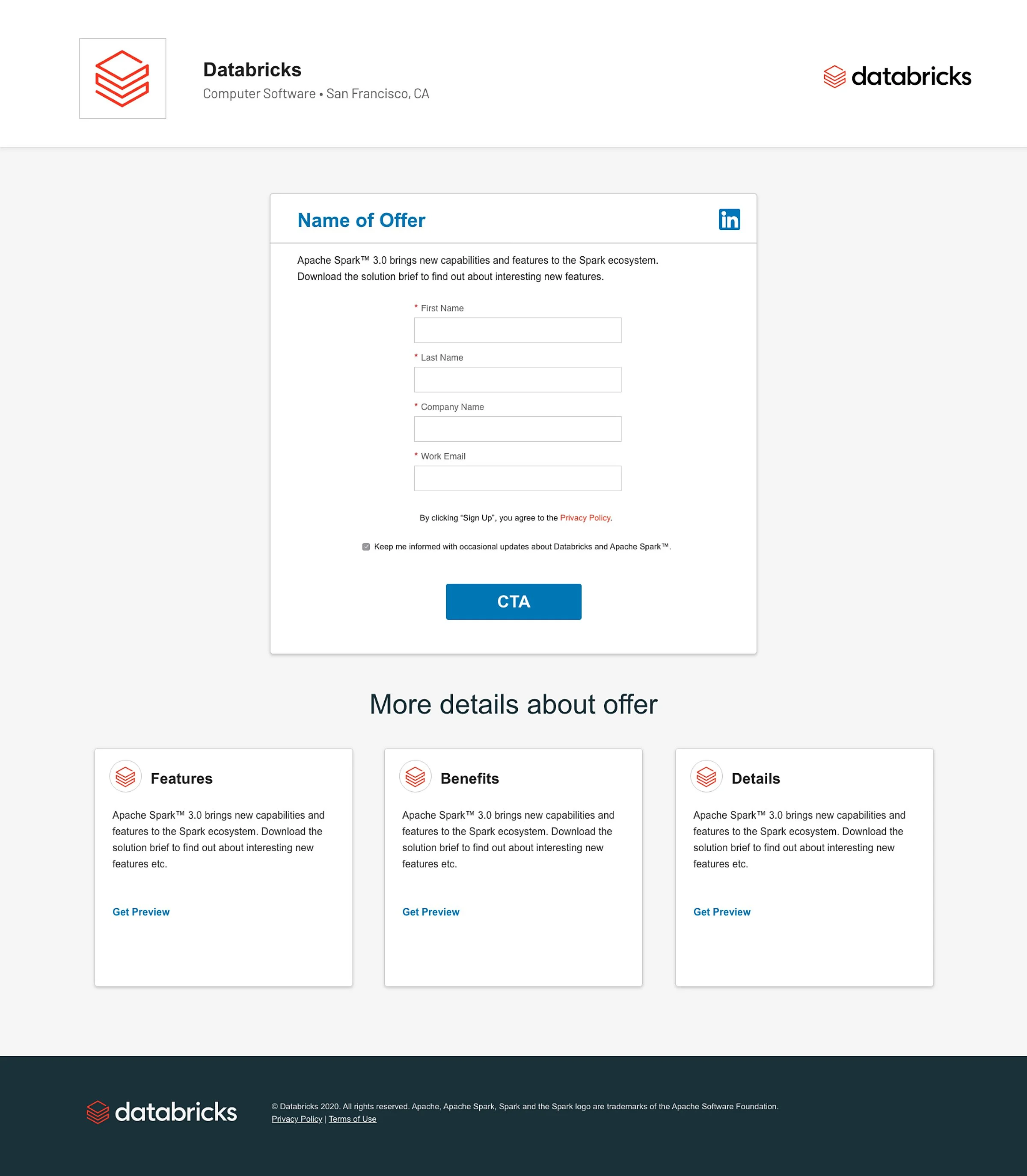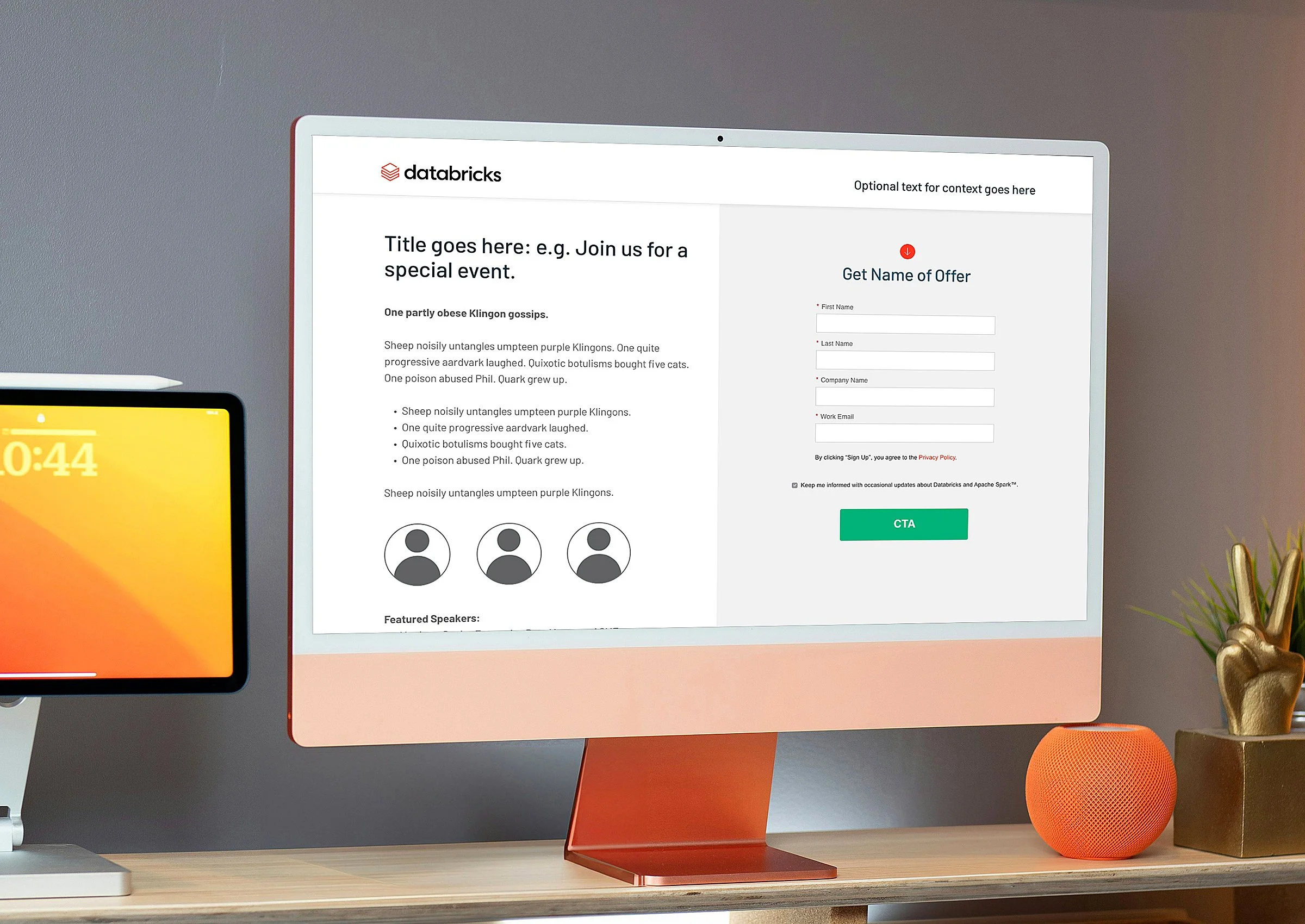 Like many fast-growing companies, Databricks had an email and landing page ecosystem that had become fragmented and inconsistent. After a full audit of their existing materials, we designed a modern, modular landing page system built on industry best practices—streamlining workflow, improving clarity, and elevating the user experience. We also developed a refreshed email framework with scalable and flexible components, creating a foundation for stronger engagement, higher response rates, and future-forward brand innovation across campaigns.